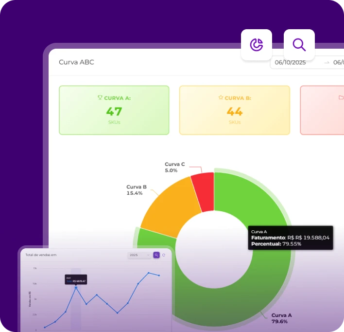 Centralize sua gestão de marketplaces. Evite atrasos com alertas de despachos, analise a Curva ABC, descubra horários de pico com o Mapa de Calor e muito mais. Tenha total controle financeiro e logístico da sua operação em um único painel.